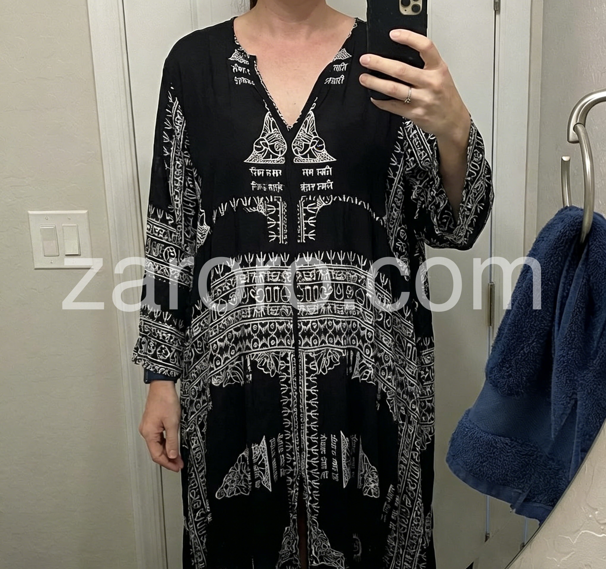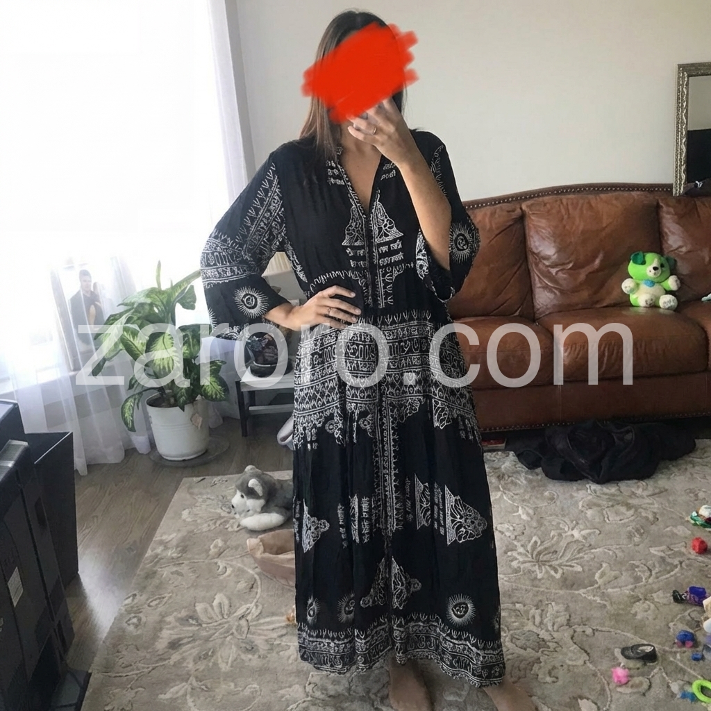 I’m obsessed with this black and white printed dress! The detailed ethnic patterns add so much character, and the oversized silhouette is both cozy and stylish. The fabric is soft and breathable, ideal for warm weather. I’ve worn it to brunch and a beach picnic, and it always gets compliments. It’s the ultimate piece for embracing a laid-back, boho vibe!
